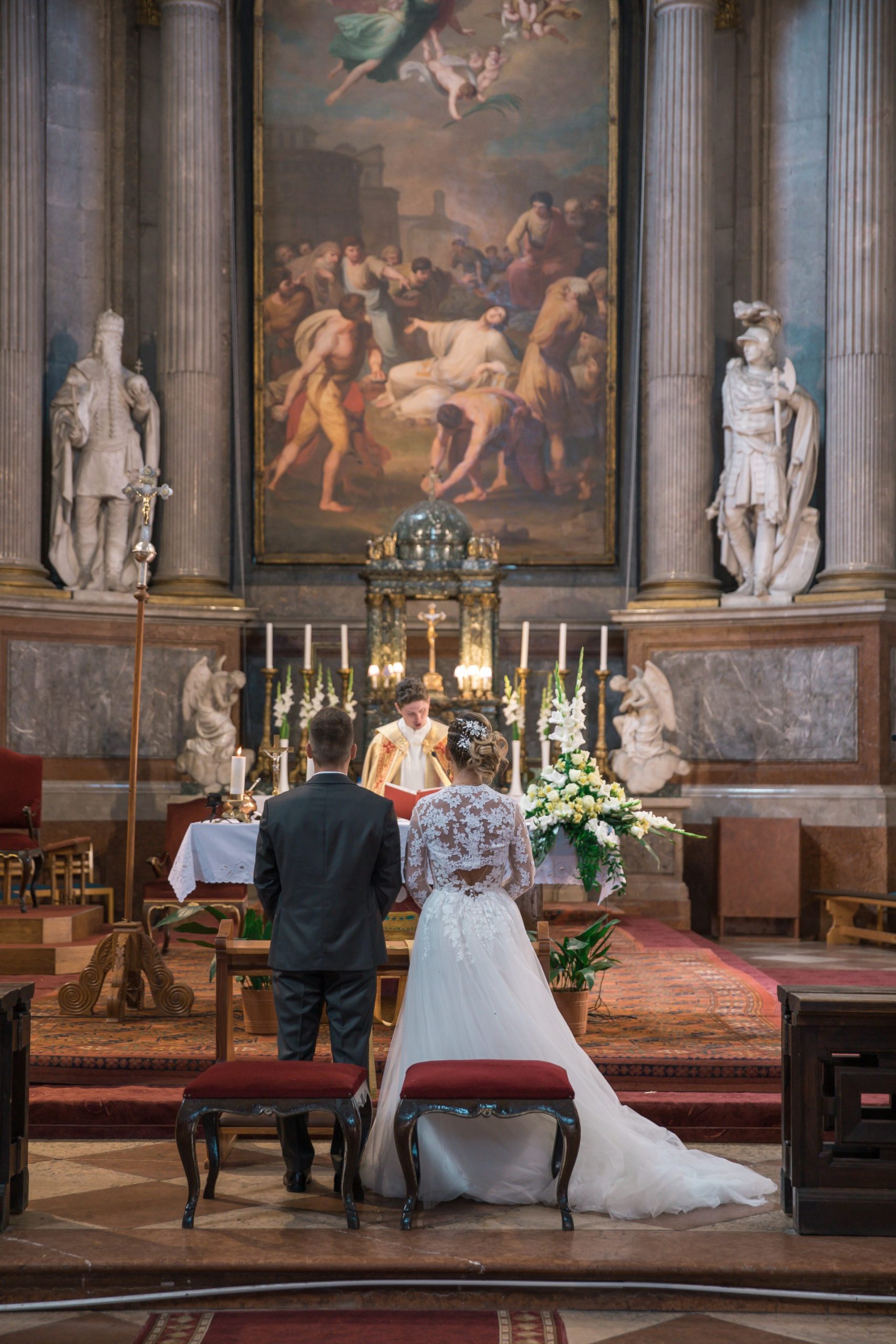 Itt a fotós láthatatlan megfigyelő. A fontos pillanatok: a bevonulás, az igenek kimondása, a gyűrűhúzás, az első csók és a kivonulás a gratulációkkal.