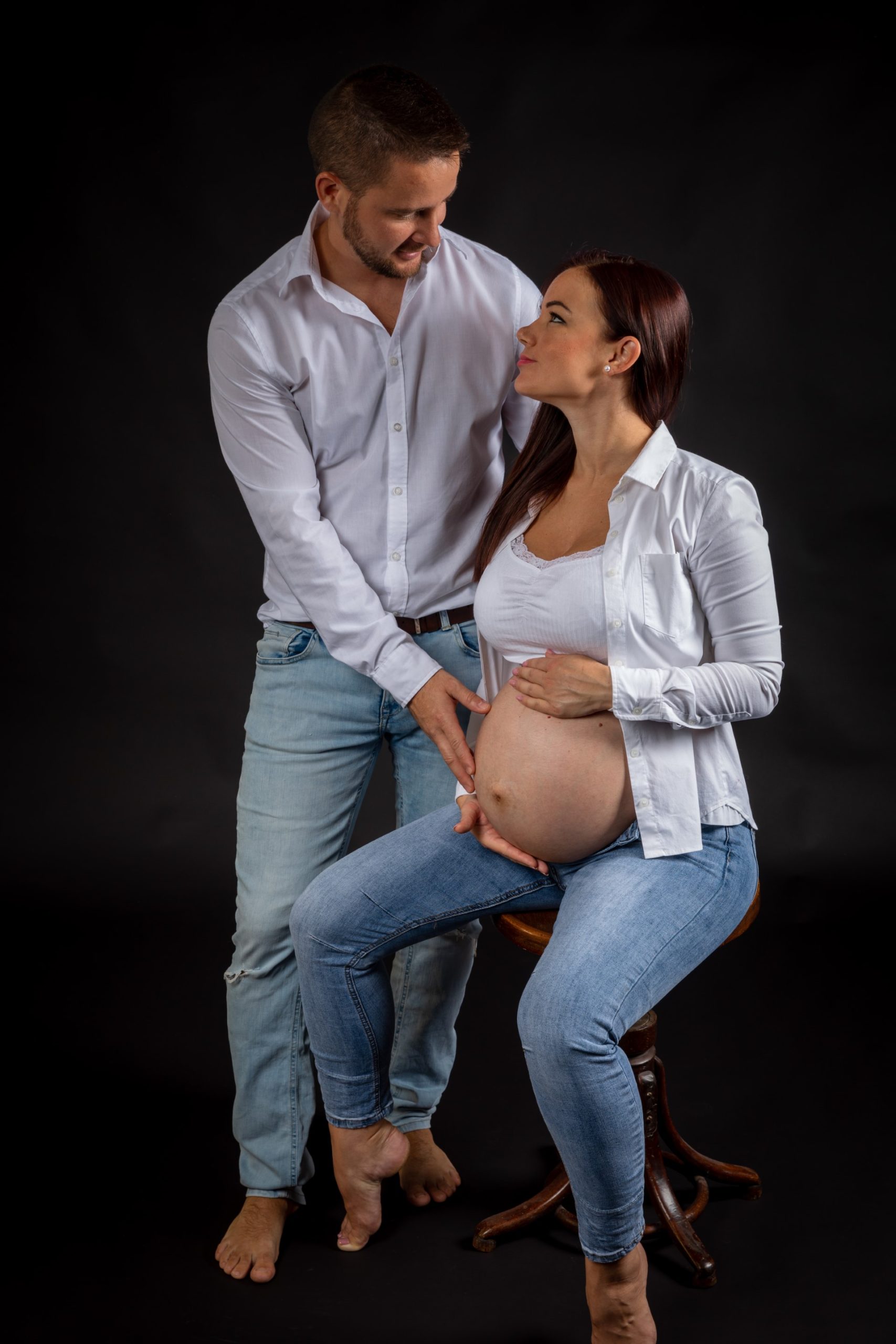 - Stúdió (Minimalista vagy Fine Art): Itt a fény-árnyék játékkal hangsúlyozzuk a pocak vonalait. Lehet elegáns (estélyi ruha) vagy egészen letisztult (fehérnemű, ing, farmer).